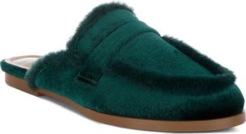 Enjoy the luxurious style of a soft velvet mule trimmed in fluffy faux fur and grounded by a flat sole.