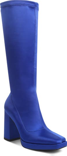 A platform and stacked heel ease your stride in a knee-high boot crafted from soft, stretchy satin for a comfortable fit.