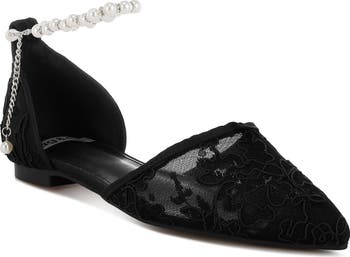 Dance the night away in this romantic corded lace d'Orsay flat secured by a removable pearly strap or wrap-around ribbon ties.