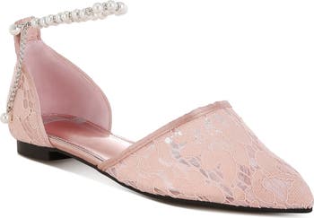 Dance the night away in this romantic corded lace d'Orsay flat secured by a removable pearly strap or wrap-around ribbon ties.