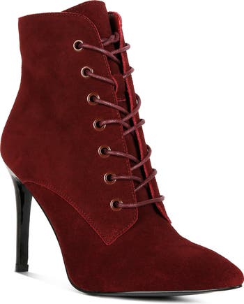 A spiked, stiletto heel supports the divine silhouette of a pointed-toe boot furnished with adjustable laces and a side zipper for easy on-and-off access.