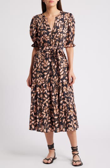 Flared cuffs sweeten the look of this ruffle-hem dress finished with gleaming mother-of-pearl buttons and a matching tie belt.