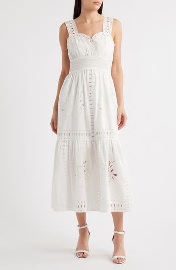 Go for a walk in this beautiful, sunny-day dress made from crisp cotton and featuring a shapely smocked waist and allover intricate eyelet embroidery.
