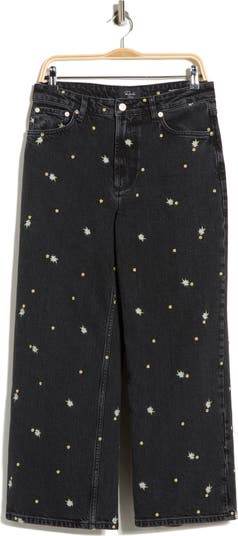 Embroidered flowers bring instant charm to these high-waisted wide-leg jeans cut from comfortable cotton denim in a playfully cropped silhouette.