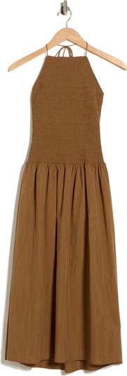Soft, flexible smocking contours the bodice of a sleeveless maxi dress framed with skinny neck ties and a graceful midi-length skirt.