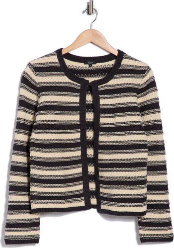 Feel the warmth of this striped cardigan knit from a blend of soft cotton yarns and secured with a hook-and-eye clasp.