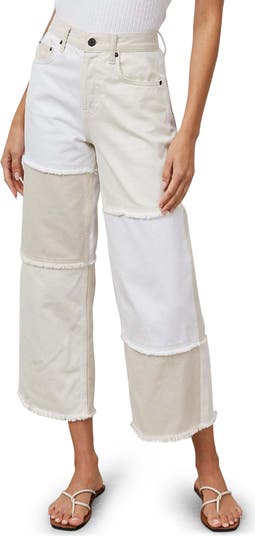 Neutral-tone patchwork creates a vintage-inspired look in these wide-leg jeans cut from nonstretch denim and topped with a high waist.