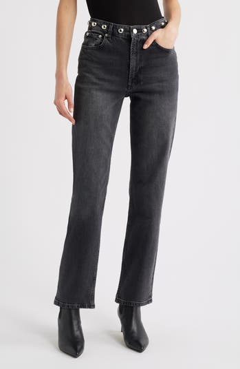 Made from washed low-stretch denim, these vintage-inspired jeans have a high waist, full-length straight legs and polished studs as a built-in accessory.