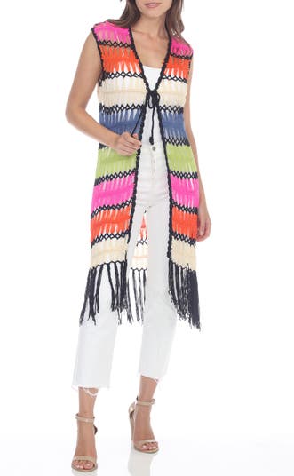 Complete your everyday outfits with a bold pop of color in this open‑stitched sweater‑vest finished with flowy fringe.