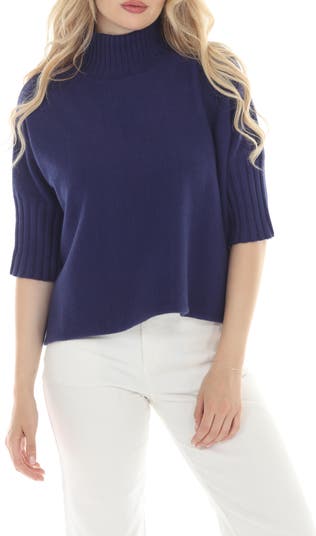 A ready-to-layer sweater knit in a boxy silhouette features a ribbed mock neck and three-quarter sleeves for contemporary appeal.
