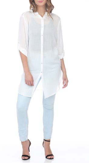 Semi‑sheer fabric and vertical stripes create a breezy fit and feel in this long‑sleeve, longline tunic top, perfect for elevating your casual wardrobe.