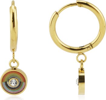 A digi-inspired rainbow halo frames the round-cut crystal that gives a pretty sparkle to a dangle charm on huggie hoop earrings.