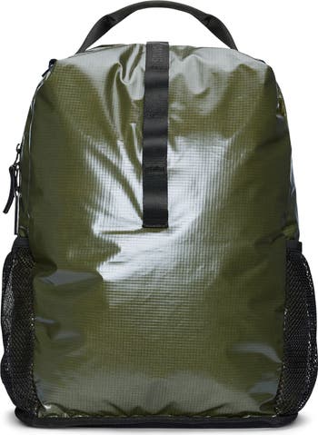 This backpack, influenced by the outdoors, is made from nylon ripstop with a waterproof coating and features a C-clip closure in front. Unclip the front closure to reveal a 'hidden' pocket or clip over for extra security when traveling.