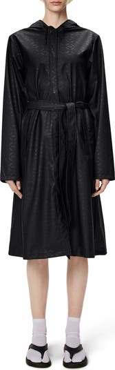Enhanced waterproof protection and chic style come together on this hooded coat crafted in a lengthy A-line silhouette and cinched with a self-tie belt.