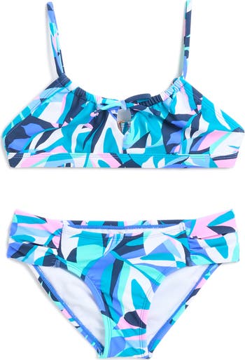 A geometric pattern turns up the fun vibe of this matching bikini crafted from soft, stretchy fabric to ease their movements whether playing along the sand or taking a dip in the ocean.
