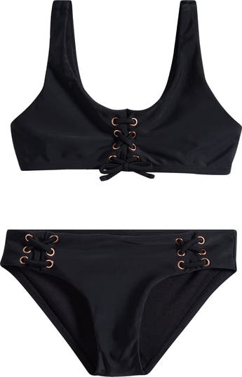 A lace-up detail adds trendy appeal to this two-piece swimsuit that is cut for your kiddo.