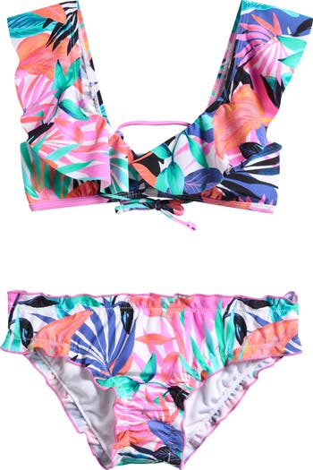 They'll love to splash and play in this two-piece swimsuit that features ruffles over the shoulders and scrunched bottoms in a vivacious print.
