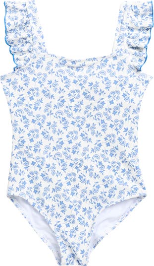 Your beach-loving kiddo will swoon over the cute style of this one-piece swimsuit designed with plenty of stretch and ruffled cap sleeves.
