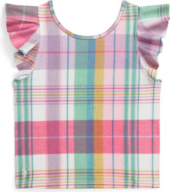 A soft jersey tank with ruffled sleeves and a bright plaid pattern brings all the charm to school days and weekend fun.