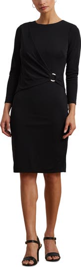 A polished ring emphasizes the gathered effect that defines the front of a jersey dress done in a matte finish for enhanced sophistication.