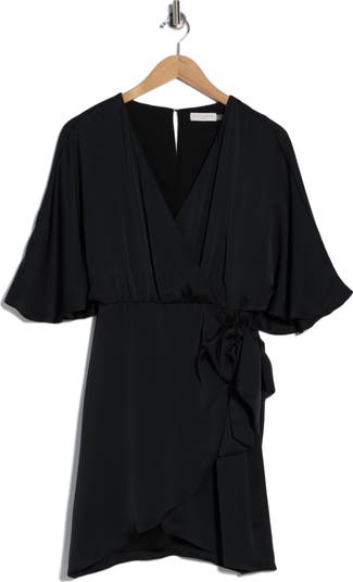 A gracefully draped satin dress crafted in an faux-wrap design features a surplice V-neck, fluttery batwing sleeves and a self-tie sash for elegant style.