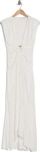 A polished U‑shaped hardware accent lends sultry style to this flowy dress softly shaped with side ruching.