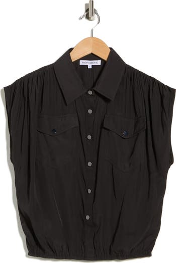 Easily go from work to weekend in this shirred-shoulder shirt secured with polished snaps.