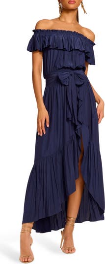 A crinkled texture and flirty ruffles add charming style points to a graceful dress designed to show off your shoulders.