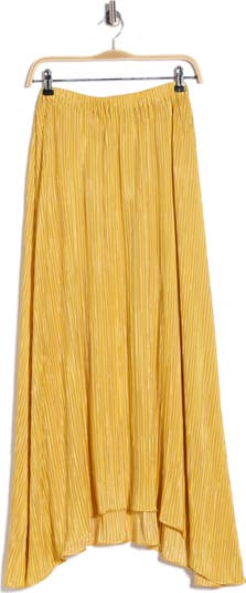 A curved hem flutters with every step on this striped maxi skirt topped with a comfortable elastic waist.
