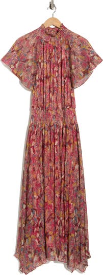 Shimmering with a metallic sheen, this dress features a smocked neck and waist with fluttery sleeves for a flattering yet playful silhouette.