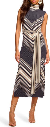 Neutral hues pattern a chevron-striped dress that serves a bit of sass with a triangular opening cut out of the back.