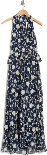 A halter silhouette shows off your back and shoulders in a charming floral-embroidered dress sure to impress on special occasions.