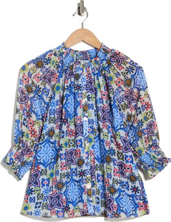 Framed by smocking around the three-quarter length sleeves and collar, a lightweight chiffon top is finished with a glossy button-front closure that fades into the vibrant print.