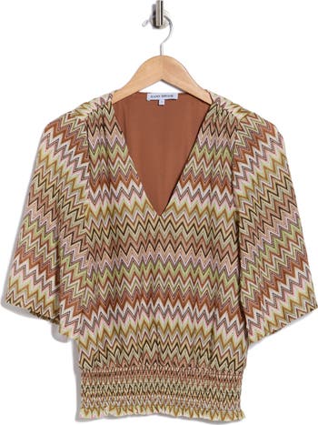 This V-neck top features flowy sleeves, a smocked waist and a chevron knit pattern that creates an effortless look.