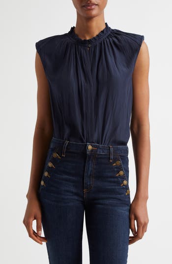 Soft gathers lend to a blousy fit on this lightweight top accented with sharp shoulder pleats and a fanciful frilly collar.