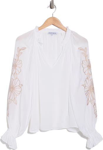 This split-neck top features long sleeves adorned with floral embroidery and finished with elastic cuffs, creating a soft, romantic silhouette with effortless movement.