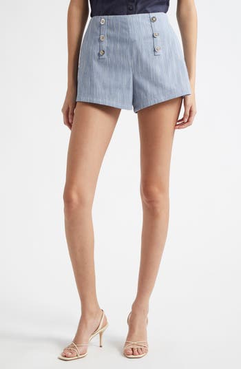 A high waist and glossy front buttons define these leggy sailor shorts updated with patterned stitching for textural interest.