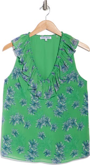 Flowy ruffles outline the V‑neckline of this weekend‑ready sleeveless top covered in fern‑leaf motifs.