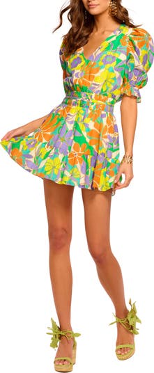 Vibrant hues highlight the retro floral pattern of a puff-sleeve minidress structured with a smocked waist.