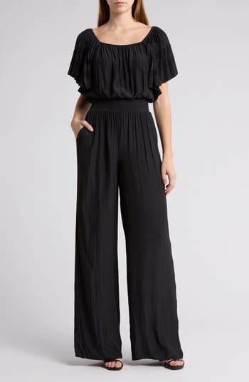 Set the trend in this sultry off-the-shoulder jumpsuit fashioned with fluttery sleeves and a flowy wide-leg silhouette.