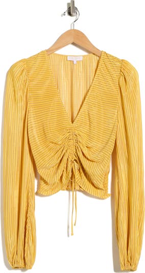 Perfect your date-night ensembles with this finely pleated crop top featuring a light-catching metallic finish and dramatically ruched front seam.