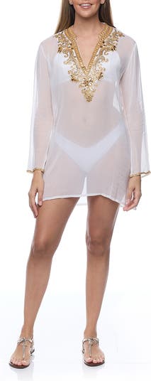 Lounge poolside or stroll into happy hour wearing this chic long-sleeve tunic embellished with eye-catching crystals.
