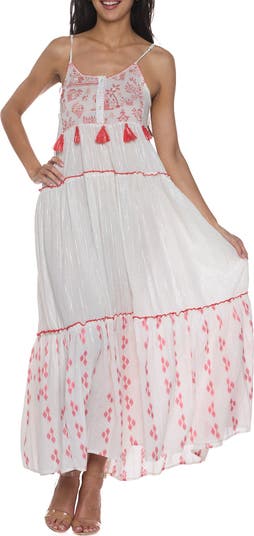 Shimmering threads and tassel embellishments lend eye-catching detail to a tiered maxi dress sure to charm any audience.