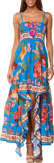A smocked bodice and a floral print enhance the warm-weather aesthetic of this flowy maxi dress finished with a high-low hemline.