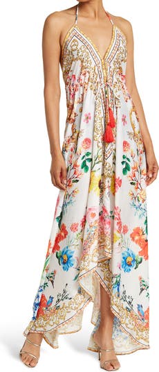 Vivacious floral printing blooms across a lightweight, cover-up dress featuring a halter neckline for an ultra chic, post-swim look.