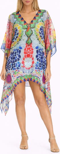 Flow from the resort to dinner on the beach in this poncho framed by three-quarter sleeves and covered in a bold geometric print.