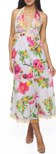 Bring vibrant style to your vacation look with this light and breezy halter maxi dress that is decorated in a floral print.