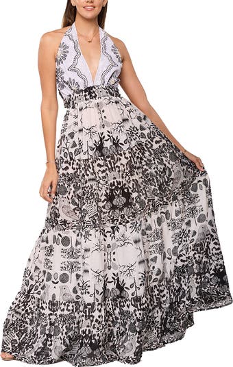 Inky blooms and parrots bring stark contrast to this flowy maxi dress perfect for elevating your warm-weather looks.