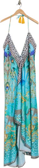Move effortlessly from beach to boardwalk in this halter maxi dress featuring a vibrant mixed print and a high-low hem.