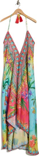 Move effortlessly from beach to boardwalk in this halter maxi dress featuring a vibrant mixed print and a high-low hem.